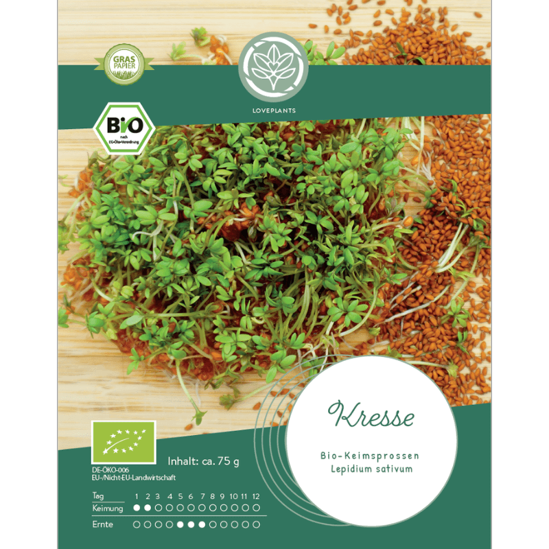 Inhalt: (DE-ÖKO-006)Saatgut ca.75g Bio Kresse Sprossen Samen