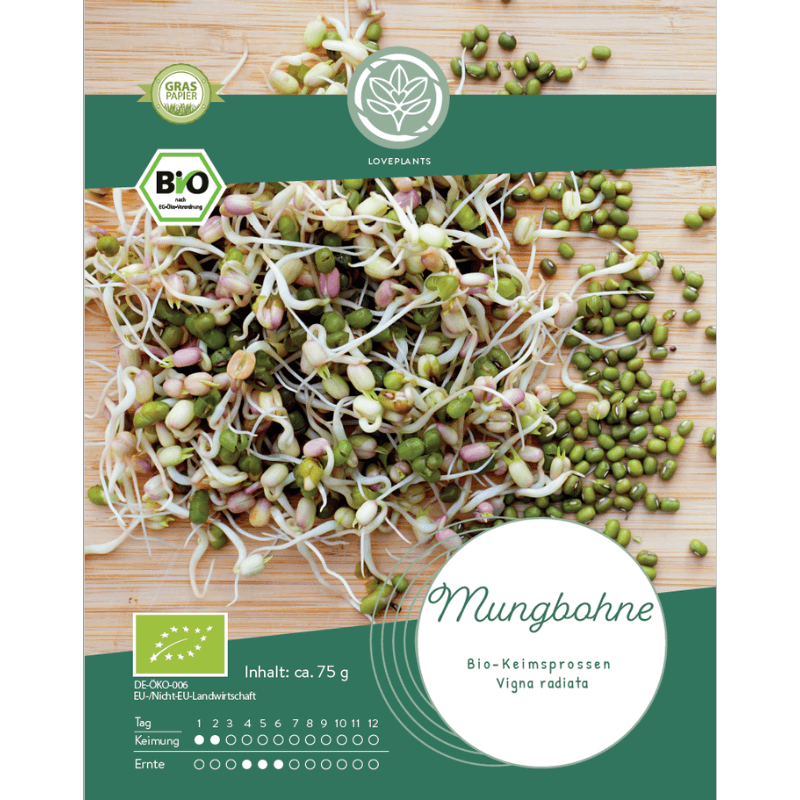 Inhalt: (DE-ÖKO-006)Saatgut ca. 75 g Bio Mungobohnen Sprossen Samen