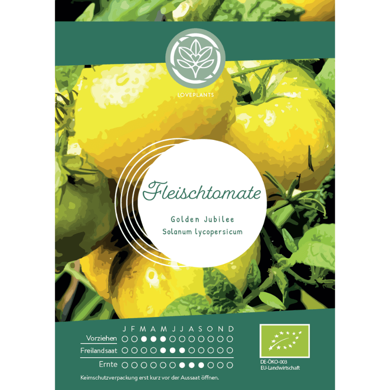 Die Fleischtomate Golden Jubilee ist eine sehr fruchtig-süß schmeckende Tomaten Sorte mit geringer Säure. Daher wird sie gerne für Salate, zum Grillen oder für den direkten Verzehr verwendet. Die bis zu 250 g schweren Früchte erreichen einen Durchmesser von ca. 8 cm. Die Tomaten sind eine sehr gesunde und leckere Alternative zu Supermarkt Tomaten. Neben dem einzigartigen Geschmack bietet sie viele wichtige Vitamine, Mineralstoffe und Spurenelemente. Der wertvollste Inhaltsstoff ist wohl das Lycopin. Der Pflanzenstoff ist dafür verantwortlich, dass die reifen Tomaten Ihre Färbung entwickeln. Außerdem stärkt der Farbstoff unsere Immunabwehr und wirkt krebsvorbeugend. Um dir nur die beste Qualität zu bieten, haben alle unsere Samen zu 100% Bio Qualität. Mit dem Kauf unserer Bio Fleischtomate Golden Jubilee Samen tust du aber nicht nur dir selbst etwas Gutes, sondern auch unserer Umwelt. Alle unsere Bio Samen sind schonend und nachhaltig gezüchtet und vermehrt worden. Keine Pestizide, keine Genmanipulation, einfach Natur pur. Jetzt Tomate Golden Jubilee Samen kaufen.