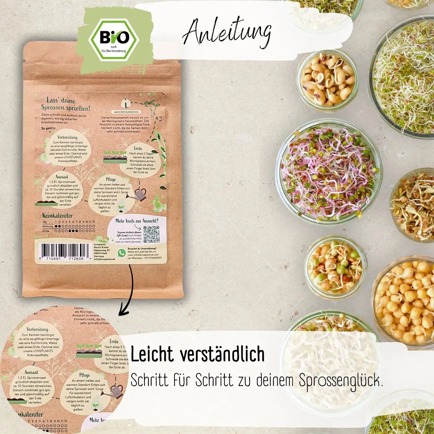 Auch Anfänger, die noch keine Erfahrungen mit der Sprossenanzucht gesammelt haben, können auf unseren Loveplants Support zählen. Bei uns findest du eine Vielzahl an Informationen zu deinem Superfood. So befindet sich auf jeder Saatguttüte ein QR-Code, der dich zu unserem Sprossenratgeber führt. Dort kannst du alles Wissenswerte über die Aufzucht, Pflege und Ernte erfahren. Auch bei individuellen Fragen sind wir für dich da. Man kann uns jederzeit über WhatsApp, Facebook, per E-Mail oder telefonisch kontaktieren. Die Zufriedenheit unserer Kunden steht immer an erster Stelle. Deshalb kann man sich darauf verlassen, dass wir jedes Problem lösen.