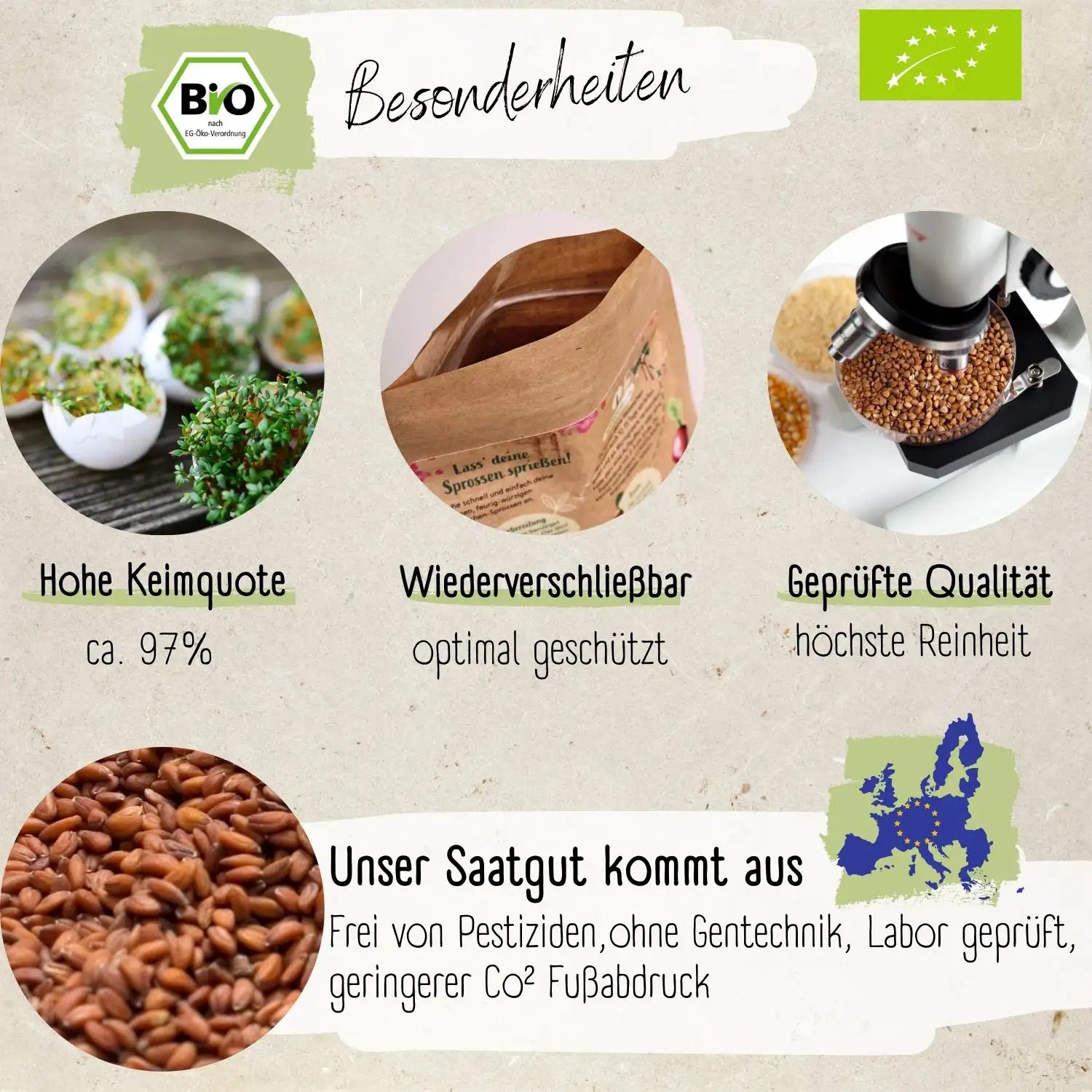Damit man frische und gesunde Kresse Sprossen anziehen kann, ist die Qualität der Kresse Saat entscheidend. Daher verwenden wir für unser Kresse Saatgut ausschließlich Bio zertifizierte und unbehandelte Samen. Somit können wir gewährleisten, dass die Keimsaat frei von Schadstoffen, Chemikalien und Pestizidrückständen ist. Zusätzlich dazu, werden unsere Bio Kressesamen regelmäßig auf Keimeigenschaften kontrolliert, denn erst ab einer Keimquote von mehr als 80% wird unser Bio Kresse Saatgut für den Verkauf zugelassen.